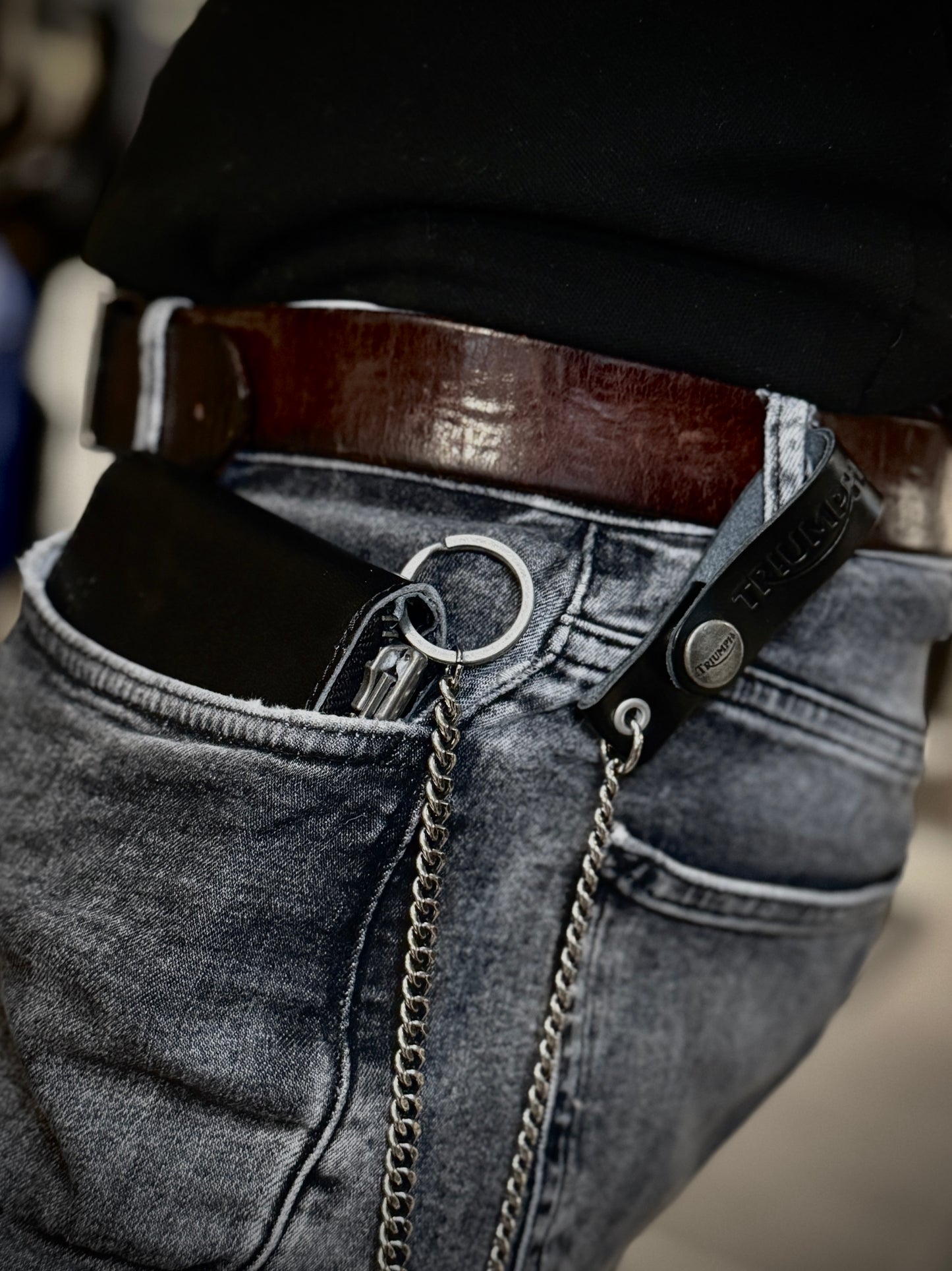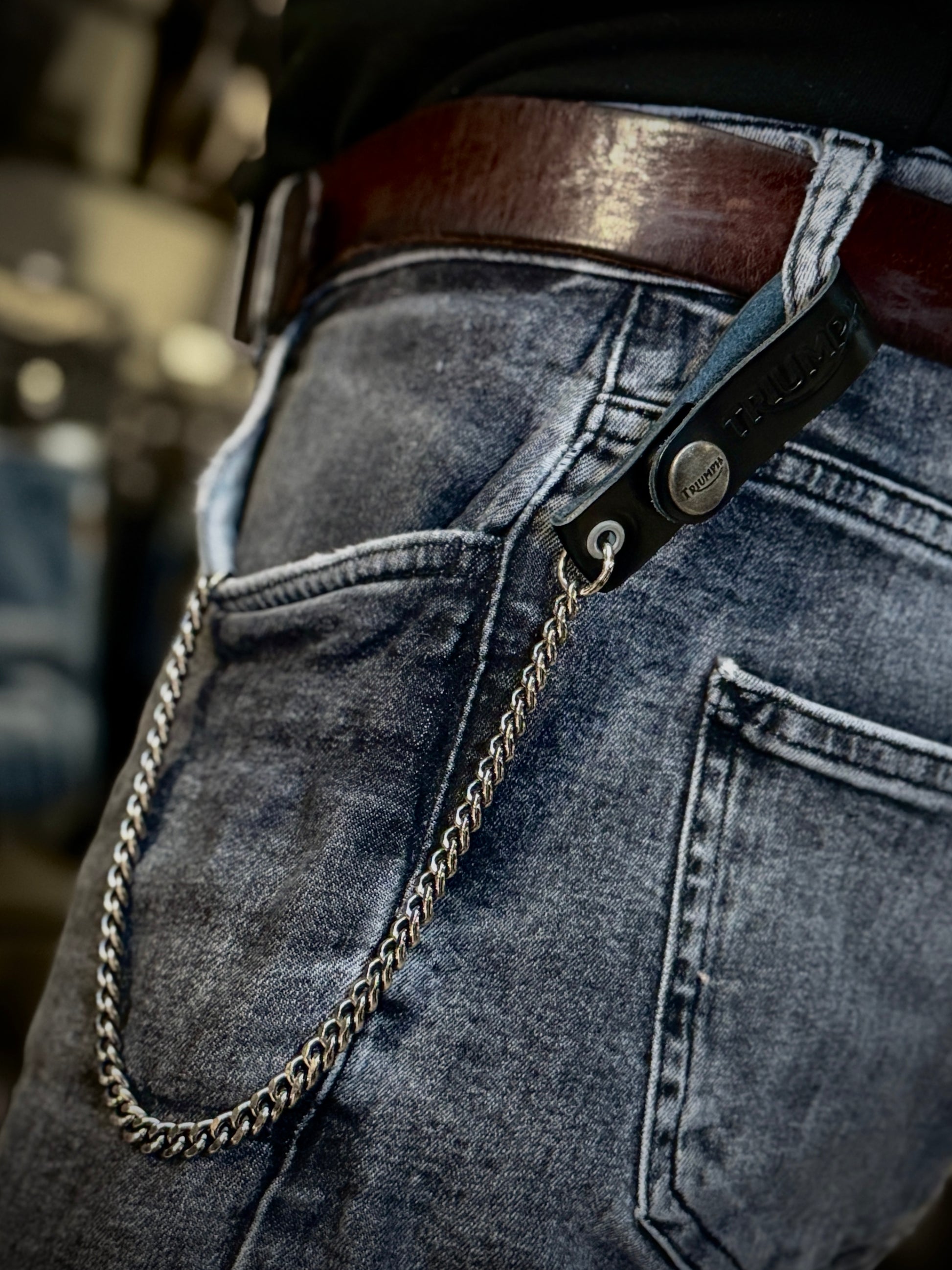 Triumph Black Leather Chain Lanyard offers a perfect blend of functionality and style