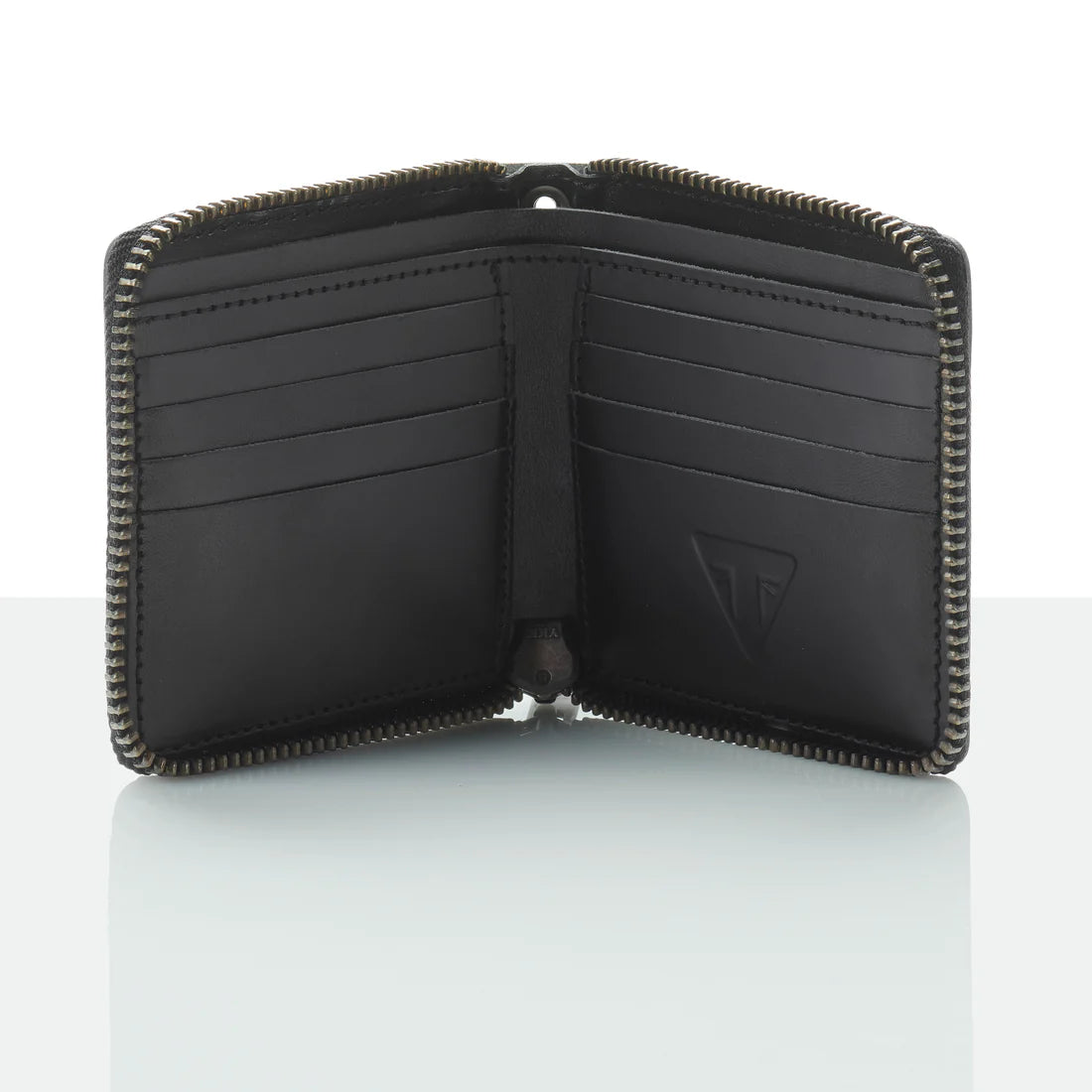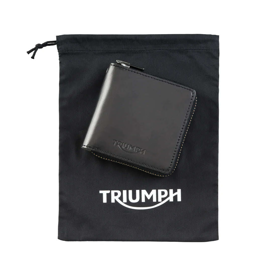 The Triumph Black Leather Square Zip Wallet is a refined accessory designed for those who appreciate both style and functionality.