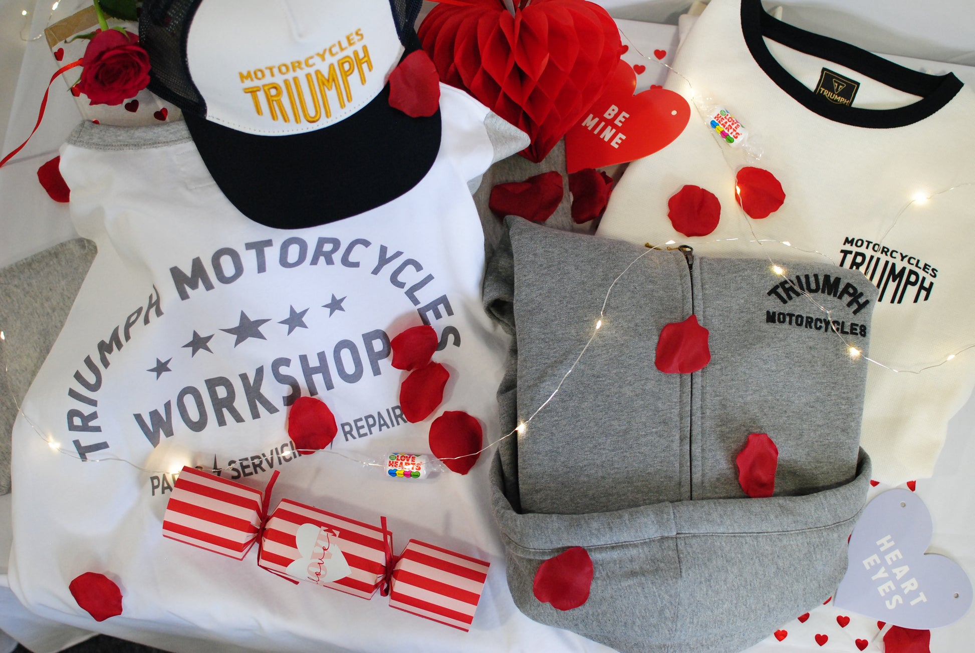 Soft 100% Cotton tee in White with Black short sleeves, Black crew neck, stylised Triumph Motorcycles print to left chest, signature woven badge at left hip and Triumph Workshop arched design in Black soft-touch print to the rear.