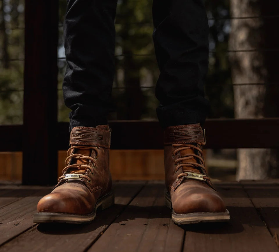 The men’s Vntg Moto workwear style offers a traditional plain-toe lace-up with Harley-Davidson edge thanks to the top buckle with a logo emboss.
